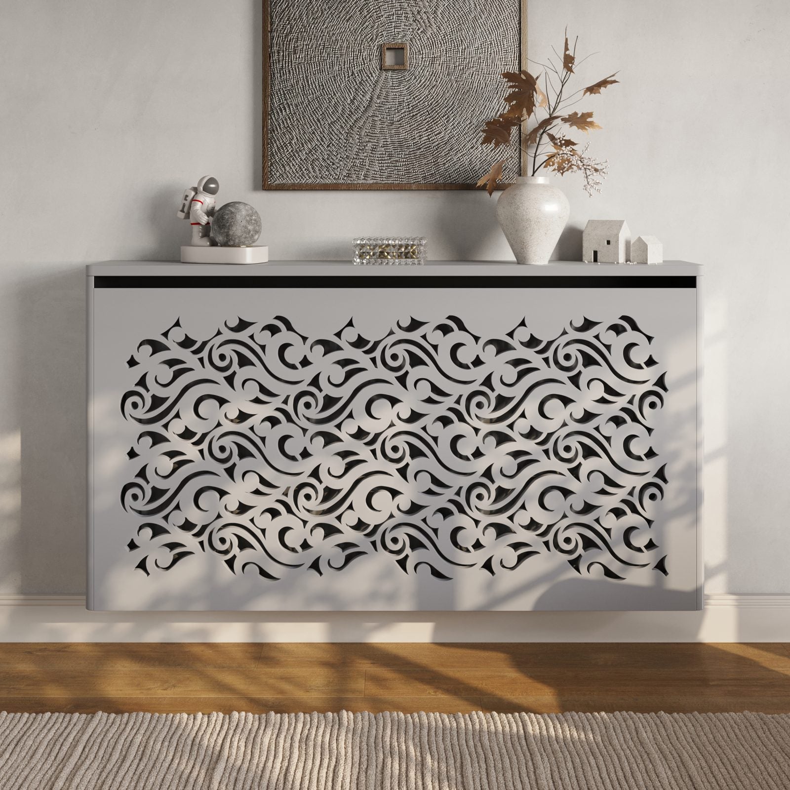 The Baroque Range Floating Cabinet showcases an ornate yet romantic design, creating a stunning focal point in any interior. Designed to elegantly conceal a radiator, it also offers practical shelving space for displaying decorative homeware, seamlessly blending style with functionality.